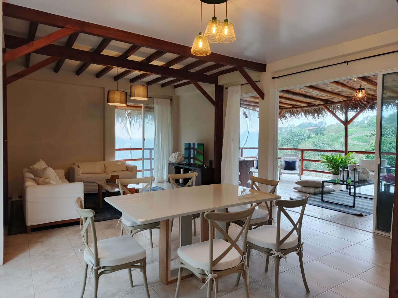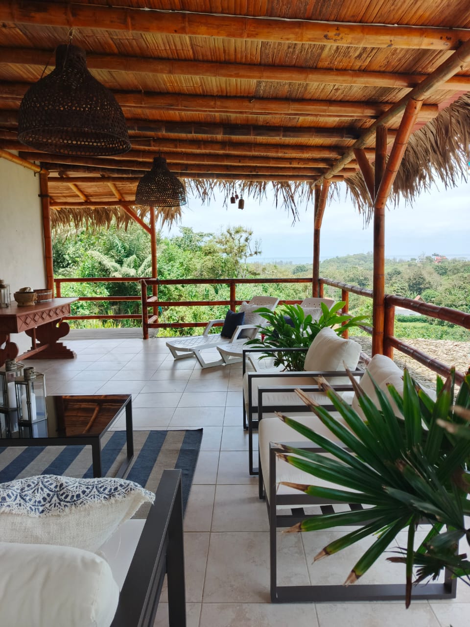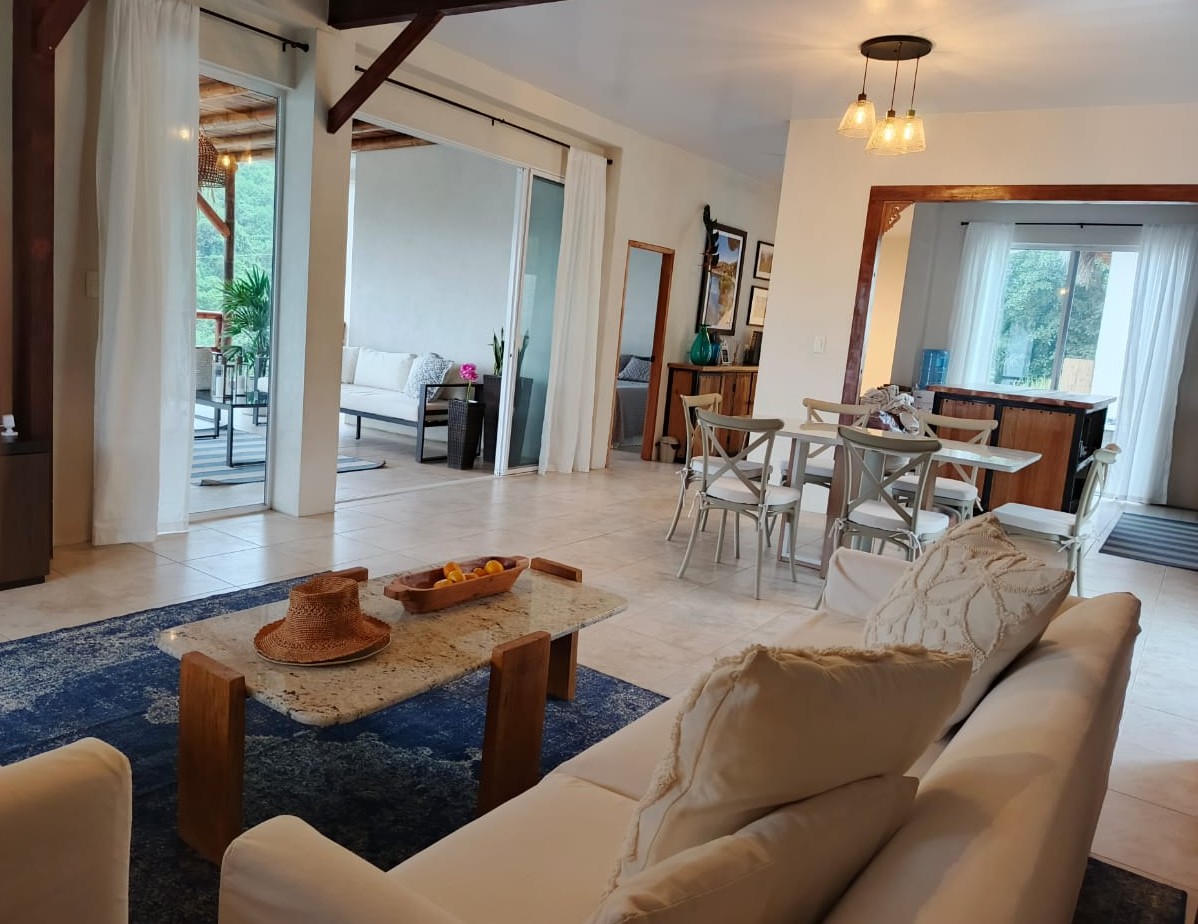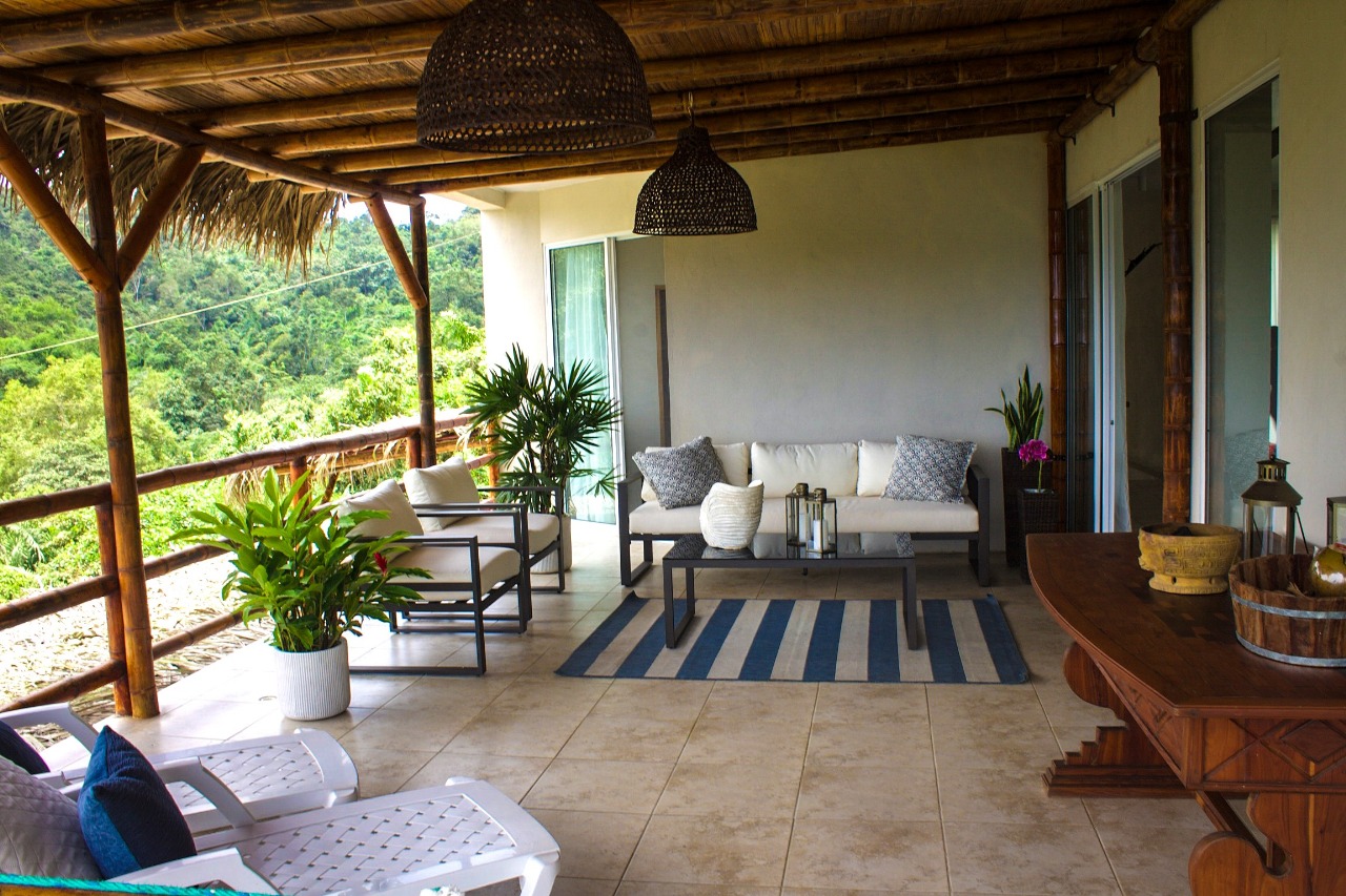 The ground level, also your main entrance has two bedrooms and two bathrooms, both bedrooms have access to an outside deck area surrounded by lush plants and comfortable hammocks for you to relax. On the second level, which is also the “main” level you have an open style kitchen, dining area and living room. As well as master bedroom with large bathroom and walk in closet. Large outdoor balcony/deck area equipped with exterior furniture. All the furnishings (many of which are custom made), appliances and decorations come included with the sale of this home!! There is a third floor watching deck which the owners have converted into a small “yoga shala.” The views all around are absolutely breathtaking. The outdoor are has grass, a fire pit and access to a separate “casita” which is currently being used as a storage room but can be transformed into a caretaker’s suite or visitor’s suite. There are 3 retaining walls built, the property is sturdy and has an incredible foundation. The property comes with parking (fits two vehicles) as well as a fully functional and brand new power bank which could supply the entire house with electricity for up to 6 hours in the event of any power outages.